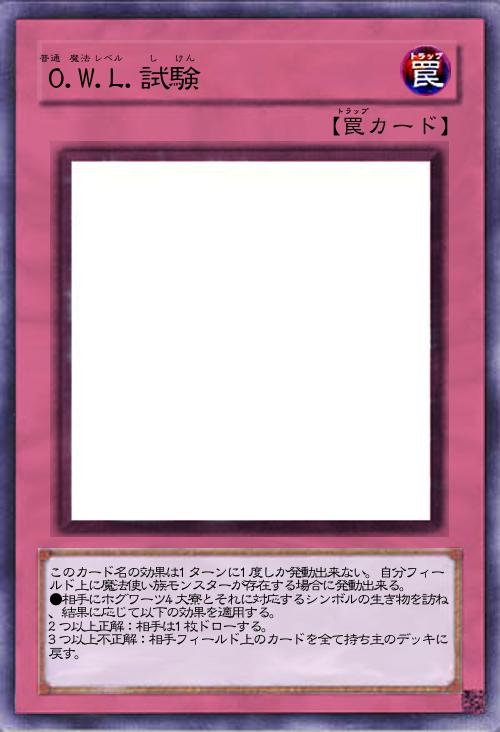 相手にホグワーツにまつわるクイズを出題し、その成績に応じて効果が変化する罠カード。ハリーポッターを見たことのある人なら答えられる程度の難易度となっているが、見たことのない人には少し厳しい試験になるかも知れない。ちなみに正解は以下の通り。