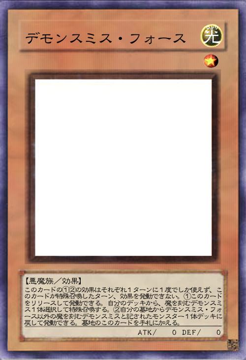 | このカードの①②の効果はそれぞれ1ターンに1度でしか使えず、このカードが特殊召喚したターン、効果を発動できない。①このカードをリリースして発動できる。自分のデッキから、魔を刻むデモンスミス1体選択して特殊召喚する。②自分の墓地からデモンスミス・フォース以外の魔を刻むデモンスミスと記されたモンスター1体デッキに戻して発動できる。墓地のこのカードを手札に加える。 | |||