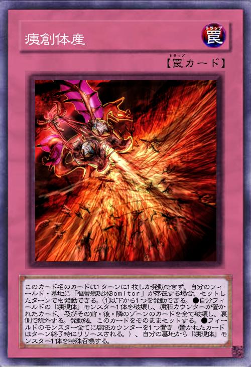 | このカード名のカードは1ターンに1枚しか発動できず、自分のフィールド・墓地に「嘔蕾痍現体Bomitor」が存在する場合、セットしたターンでも発動できる。①以下から1つを発動できる。●自分フィールドの「痍現体」モンスター1体を破壊し、腐胚カウンターが置かれたカード、及びその前・後・隣のゾーンのカードを全て破壊し、裏側で除外する。発動後、このカードをそのままセットする。●フィールドのモンスター全てに腐胚カウンターを1つ置き(置かれたカードはターン終了時にリリースされる。)、自分の墓地から「痍現体」モンスター1体を特殊召喚する。 | |||