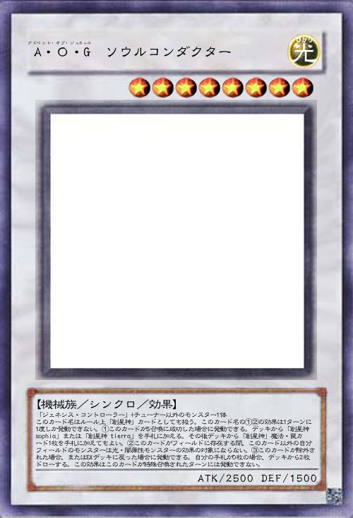 | 「ジェネシス・コントローラー」+チューナー以外のモンスター1体 このカード名はルール上「創星神」カードとしても扱う。このカード名の①②の効果は1ターンに1度しか発動できない。①このカードがS召喚に成功した場合に発動できる。デッキから「創星神 sophia」または「創星神 tierra」を手札に加える。その後デッキから「創星神」魔法・罠カード1枚を手札に加えてもよい。②このカードがフィールドに存在する間、このカード以外の自分フィールドのモンスターは光・闇属性モンスターの効果の対象にならない。③このカードが除外された場合、またはEXデッキに戻った場合に発動できる。自分の手札が0枚の場合、デッキから2枚ドローする。この効果はこのカードが特殊召喚されたターンには発動できない。 | |||