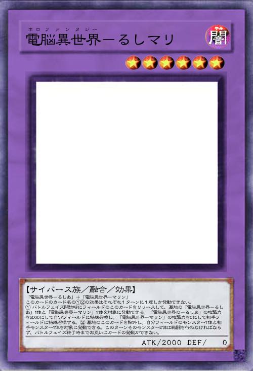 | 「電脳異世界-るしあ」+「電脳異世界-マリン」 このカードのカード名の①②の効果はそれぞれ1ターンに1度しか発動できない。 ①∶バトルフェイズ開始時にフィールドのこのカードをリリースして、墓地の「電脳異世界-るしあ」1体と「電脳異世界-マリン」1体を対象に発動できる。「電脳異世界の-るしあ」の攻撃力を3000にして自分フィールドに特殊召喚し、「電脳異世界-マリン」の攻撃力を0にして相手フィールドに特殊召喚する。②∶墓地のこのカードを除外し、自分フィールドのモンスター1体と相手モンスター1体を対象に発動できる。このターンそのモンスター2体は戦闘を行わなければならず、バトルフェイズ終了時までお互いにカードの発動ができない。 | |||