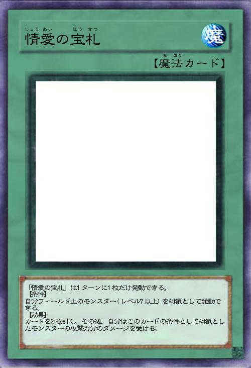 | 「情愛の宝札」は1ターンに1枚だけ発動できる。 【条件】 自分フィールド上のモンスター(レベル7以上)を対象として発動できる。 【効果】 カードを2枚引く。その後、自分はこのカードの条件として対象としたモンスターの攻撃力分のダメージを受ける。 | |||