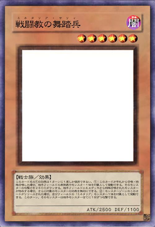 | このカード名の①の効果は1ターンに1度しか使用できない。①:このカードが手札から召喚・特殊召喚した場合、相手フィールドの表側表示モンスター1体を対象として発動できる。そのモンスターの攻撃力を2500ダウンする。相手フィールドにEXデッキから特殊召喚されたモンスターが存在する場合、さらに対象のモンスターの効果を無効にできる。②:モンスターゾーンのこのカードがリリースされた場合、自分フィールドの「ミネタリア」モンスター1体を対象として発動できる。このターン、そのモンスターは相手モンスター全てに1回ずつ攻撃できる。 | |||