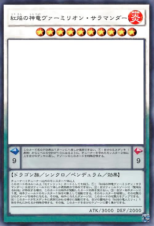 | チューナー+チューナー以外のモンスター1体以上 このカード名はルール上「セインリット」カードとしても扱う。①:「紅焔の神竜ヴァーミリオン・サラマンダー」は自分フィールドに1体しか表側表示で存在できない。②:自分フィールドゾーンに「聖域なる紅焔」が存在する場合、このカードは相手が発動したカード効果を受けない。③:自分・相手ターンに1度、相手フィールドのモンスター1体を対象として発動できる。そのモンスターを破壊し、その攻撃力分のダメージを相手に与える。その後、相手に与えたダメージ分、このカードの攻撃力をアップできる。④:このカードがEXデッキに表側で加わる場合に発動できる。自分の墓地から「紅焔の竜人ミリィ」1体を手札に加えるか特殊召喚する。その後、このカードを自分のPゾーンに置く事ができる。 | |||