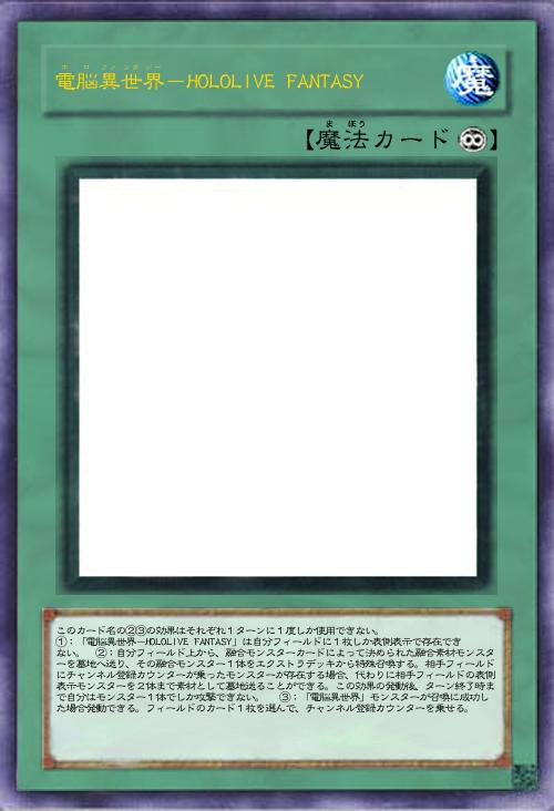 | このカード名の②③の効果はそれぞれ1ターンに1度しか使用できない。 ①:「電脳異世界-HOLOLIVE FANTASY」は自分フィールドに1枚しか表側表示で存在できない。 ②:自分フィールド上から、融合モンスターカードによって決められた融合素材モンスターを墓地へ送り、その融合モンスター1体をエクストラデッキから特殊召喚する。相手フィールドにチャンネル登録カウンターが乗ったモンスターが存在する場合、代わりに相手フィールドの表側表示モンスターを2体まで素材として墓地送ることができる。この効果の発動後、ターン終了時まで自分はモンスター1体でしか攻撃できない。 ③:「電脳異世界」モンスターが召喚に成功した場合発動できる。フィールドのカード1枚を選んで、チャンネル登録カウンターを乗せる。 | |||