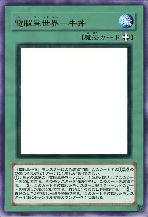 | 「電脳異世界」モンスターにのみ装備可能。このカード名の①②③の効果はそれぞれ1ターンに1度しか使用できない。 ①:自分の墓地の「電脳異世界-ノエル」1体を対象としてこのカードを発動できる。そのモンスターを特殊召喚し、このカードを装備する。 ②:このカードを装備したモンスターが相手フィールドのカードを破壊した場合発動できる。自分は1000LP回復する。 ③:自分のLPが回復した場合発動できる。このカードを装備したモンスター1体にチャンネル登録カウンターを1つ乗せる。 | |||