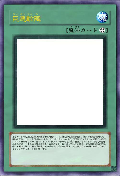 | このカード名の①②③の効果はどちらも1ターンに1度しか使用できない。①:手札を2枚捨てて発動できる。カードを2枚ドローする。②:自分フィールドの「巨悪」モンスターが戦闘で相手モンスターを破壊した時、相手に600のダメージを与える。③:自分フィールドに「混沌の巨悪 カオスマター」または「禍星の巨悪 カオスマターΩ」のどちらかが存在してる時に発動できる。手札・墓地・除外状態の「巨悪」カードを全てデッキに戻す。その後、自分の手札が6枚になるようにデッキからカードをドローする。 | |||