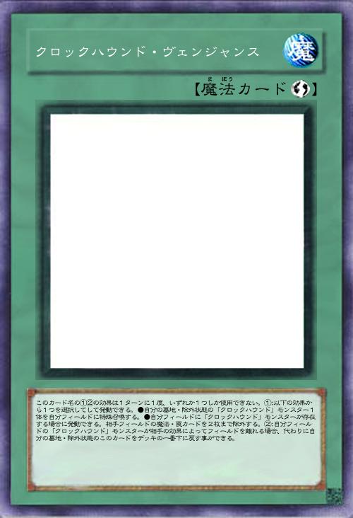 | このカード名の①②の効果は1ターンに1度、いずれか1つしか使用できない。①:以下の効果から1つを選択してして発動できる。●自分の墓地・除外状態の「クロックハウンド」モンスター1体を自分フィールドに特殊召喚する。●自分フィールドに「クロックハウンド」モンスターが存在する場合に発動できる。相手フィールドの魔法・罠カードを2枚まで除外する。②:自分フィールドの「クロックハウンド」モンスターが相手の効果によってフィールドを離れる場合、代わりに自分の墓地・除外状態のこのカードをデッキの一番下に戻す事ができる。 | |||