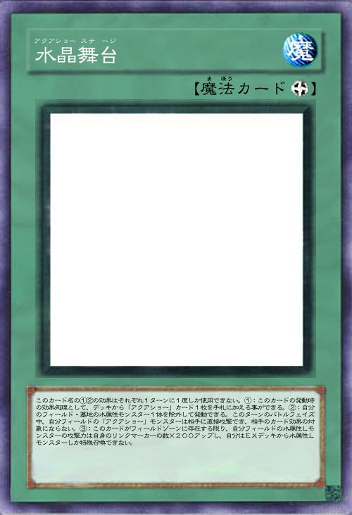 | このカード名の①②の効果はそれぞれ1ターンに1度しか使用できない。①:このカードの発動時の効果処理として、デッキから「アクアショー」カード1枚を手札に加える事ができる。②:自分のフィールド・墓地の水属性モンスター1体を除外して発動できる。このターンのバトルフェイズ中、自分フィールドの「アクアショー」モンスターは相手に直接攻撃でき、相手のカード効果の対象にならない。③:このカードがフィールドゾーンに存在する限り、自分フィールドの水属性Lモンスターの攻撃力は自身のリンクマーカーの数×200アップし、自分はEXデッキから水属性Lモンスターしか特殊召喚できない。 | |||