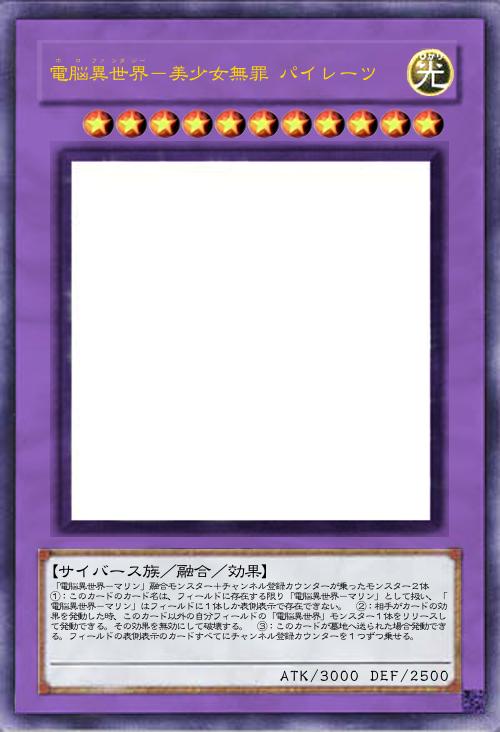 | 「電脳異世界-マリン」融合モンスター+チャンネル登録カウンターが乗ったモンスター2体 ①:このカードのカード名は、フィールドに存在する限り「電脳異世界-マリン」として扱い、「電脳異世界-マリン」はフィールドに1体しか表側表示で存在できない。 ②:相手がカードの効果を発動した時、このカード以外の自分フィールドの「電脳異世界」モンスター1体をリリースして発動できる。その効果を無効にして破壊する。 ③:このカードが墓地へ送られた場合発動できる。フィールドの表側表示のカードすべてにチャンネル登録カウンターを1つずつ乗せる。 | |||