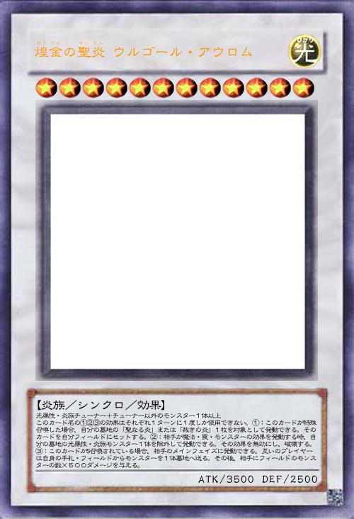 | 光属性・炎族チューナー+チューナー以外のモンスター1体以上 このカード名の①②③の効果はそれぞれ1ターンに1度しか使用できない。①:このカードが特殊召喚した場合、自分の墓地の「聖なる炎」または「裁きの炎」1枚を対象として発動できる。そのカードを自分フィールドにセットする。②:相手が魔法・罠・モンスターの効果を発動する時、自分の墓地の光属性・炎族モンスター1体を除外して発動できる。その効果を無効にし、破壊する。③:このカードがS召喚されている場合、相手のメインフェイズに発動できる。互いのプレイヤーは自身の手札・フィールドからモンスターを1体墓地へ送る。その後、相手にフィールドのモンスターの数×500ダメージを与える。 | |||