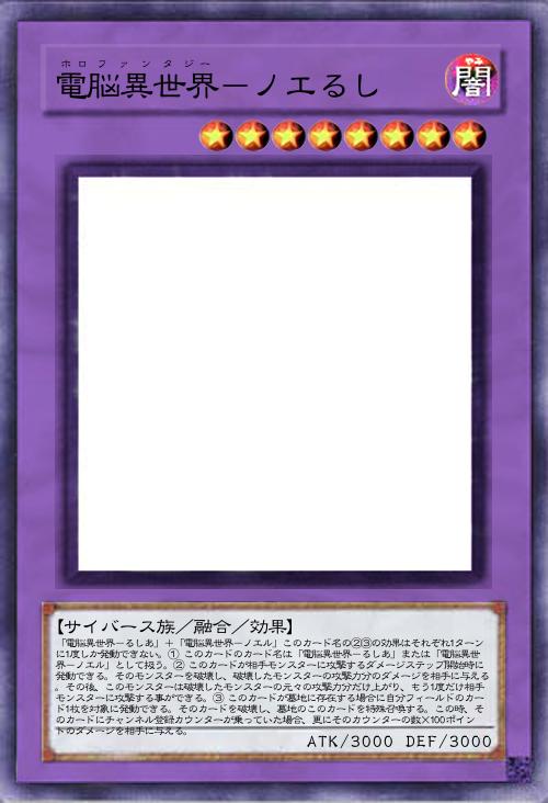 | 「電脳異世界-るしあ」+「電脳異世界-ノエル」このカード名の②③の効果はそれぞれ1ターンに1度しか発動できない。①∶このカードのカード名は「電脳異世界-るしあ」または「電脳異世界-ノエル」として扱う。②∶このカードが相手モンスターに攻撃するダメージステップ開始時に発動できる。そのモンスターを破壊し、破壊したモンスターの攻撃力分のダメージを相手に与える。その後、このモンスターは破壊したモンスターの元々の攻撃力分だけ上がり、もう1度だけ相手モンスターに攻撃する事ができる。③∶このカードが墓地に存在する場合に自分フィールドのカード1枚を対象に発動できる。そのカードを破壊し、墓地のこのカードを特殊召喚する。この時、そのカードにチャンネル登録カウンターが乗っていた場合、更にそのカウンターの数×100ポイントのダメージを相手に与える。 | |||