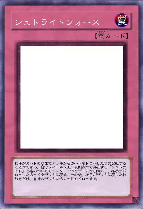 | 相手がカードの効果でデッキからカードをドローした時に発動することができる。自分フィールド上に表側表示で存在する「シュトライト」と名のついたモンスター1体をゲームから除外し、相手はドローしたカードをデッキに戻す。その後、相手がデッキに戻した枚数分だけ、自分のデッキからカードをドローする。 | |||