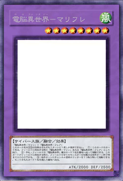 | 「電脳異世界-マリン」+「電脳異世界-フレア」 このカード名の②③の効果はそれぞれ1ターンに1度しか使用できない。 ①:このカードのカード名は、フィールドに存在する限り「電脳異世界-マリン」または「電脳異世界-フレア」として扱う。 ②:手札・フィールドの「電脳異世界」魔法カード1枚を墓地へ送って発動できる。このカードがフィールドに存在する限り、フィールドの全てのモンスターの攻撃力は相手ターン終了時まで2000下がる。 ③:相手ターンにチャンネル登録カウンターを1つ取り除いて発動できる。セットされたカード1枚を選んで墓地へ送る。 | |||