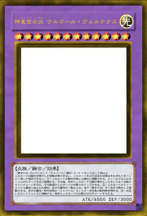 | 「黄金の炎 ウルゴール」+「ウルゴール」融合・S・X・Lモンスター1体以上 このカードは融合召喚でしか特殊召喚できない。このカード名の①②③の効果はそれぞれ1ターンに1度しか使用できない。①:このカードが融合召喚した場合に発動できる。フィールドのこのカード以外のカードを全て破壊する。その後、相手にこのカードの融合素材としたモンスターの数×500ダメージを与え、その数値分このカードの攻撃力をアップさせる。②:このカードがフィールドから墓地へ送られた場合、自分の墓地の「聖なる炎」及び「裁きの炎」を1枚ずつ除外して発動できる。自分の墓地・除外状態の「ウルゴール」モンスターを任意の数特殊召喚する。③:お互いのエンドフェイズに発動する。相手にこのカードの攻撃力分のダメージを与える。 | |||