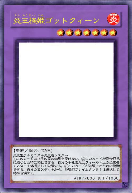 | 炎王姫ウルカニス+炎王モンスター ①このカードは相手の罠の効果を受けない。②このカードが融合召喚に成功した時に発動できる。自分の手札またはフィールド上の炎王モンスター1体選択して破壊する。②このカードが破壊された時に発動できる。自分のEXデッキから、炎魔刃フレイムタンを1体選択して特殊召喚する。 | |||