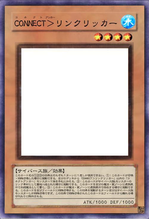 | このカード名の①②③の効果はそれぞれ1ターンに1度しか使用できない。①:このカードが召喚・特殊召喚した場合に発動できる。自分のデッキから「CONNECT>リンクリッカー」以外の「コネクトアンカー」モンスター1体を手札に加える。②:このカードがサイバース族Lモンスターのリンク素材として墓地へ送られた場合に発動できる。このカードを自分の魔法・罠ゾーンに表側表示で永続魔法として置く。③:このカードが魔法・罠ゾーンに表側表示で存在する場合に発動できる。このカードを自分フィールドに特殊召喚する。この効果を発動するターン自分はサイバース族モンスターしか特殊召喚できず、この効果で特殊召喚されたこのカードはフィールドから離れる場合代わりに除外される。 | |||