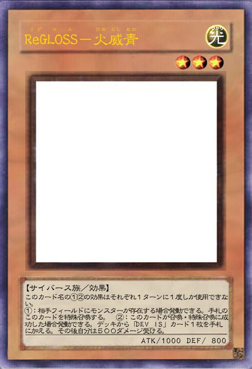 | このカード名の①②の効果はそれぞれ1ターンに1度しか使用できない。 ①:相手フィールドにモンスターが存在する場合発動できる。手札のこのカードを特殊召喚する。 ②:このカードが召喚・特殊召喚に成功した場合発動できる。デッキから「DEV_IS」カード1枚を手札に加える。その後自分は500ダメージ受ける。 | |||