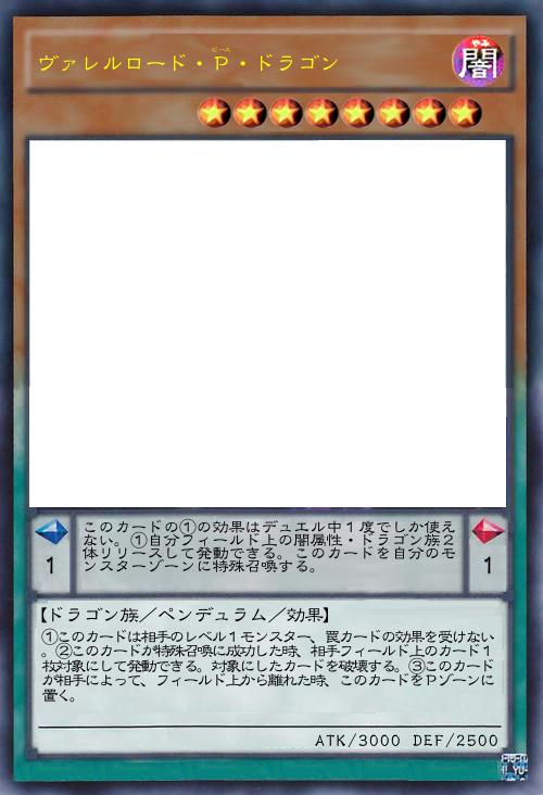 | このカードの①の効果はデュエル中1度でしか使えない。①自分フィールド上の闇属性・ドラゴン族2体リリースして発動できる。このカードを自分のモンスターゾーンに特殊召喚する。 | |||