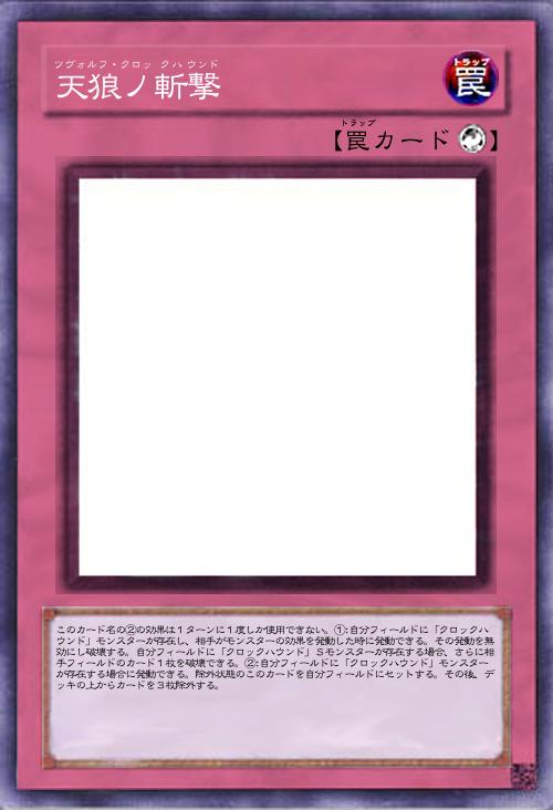 | このカード名の②の効果は1ターンに1度しか使用できない。①:自分フィールドに「クロックハウンド」モンスターが存在し、相手がモンスターの効果を発動した時に発動できる。その発動を無効にし破壊する。自分フィールドに「クロックハウンド」Sモンスターが存在する場合、さらに相手フィールドのカード1枚を破壊できる。②:自分フィールドに「クロックハウンド」モンスターが存在する場合に発動できる。除外状態のこのカードを自分フィールドにセットする。その後、デッキの上からカードを3枚除外する。 | |||