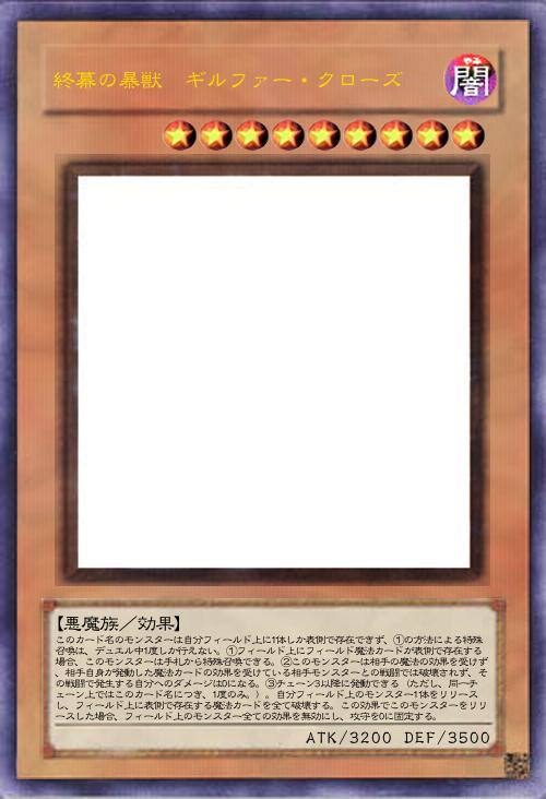 | このカード名のモンスターは自分フィールド上に1体しか表側で存在できず、①の方法による特殊召喚は、デュエル中1度しか行えない。①フィールド上にフィールド魔法カードが表側で存在する場合、このモンスターは手札から特殊召喚できる。②このモンスターは相手の魔法の効果を受けず、相手自身が発動した魔法カードの効果を受けている相手モンスターとの戦闘では破壊されず、その戦闘で発生する自分へのダメージは0になる。③チェーン3以降に発動できる(ただし、同一チェーン上ではこのカード名につき、1度のみ。)。自分フィールド上のモンスター1体をリリースし、フィールド上に表側で存在する魔法カードを全て破壊する。この効果でこのモンスターをリリースした場合、フィールド上のモンスター全ての効果を無効にし、攻守を0に固定する。 | |||