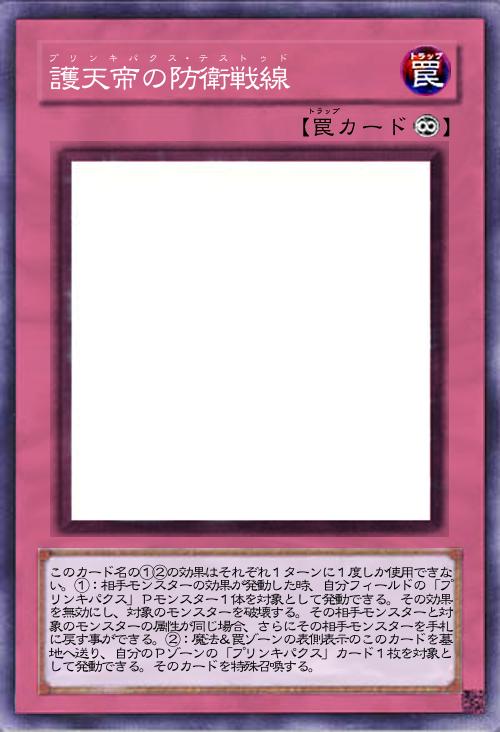| このカード名の①②の効果はそれぞれ1ターンに1度しか使用できない。①:相手モンスターの効果が発動した時、自分フィールドの「プリンキパクス」Pモンスター1体を対象として発動できる。その効果を無効にし、対象のモンスターを破壊する。その相手モンスターと対象のモンスターの属性が同じ場合、さらにその相手モンスターを手札に戻す事ができる。②:魔法&罠ゾーンの表側表示のこのカードを墓地へ送り、自分のPゾーンの「プリンキパクス」カード1枚を対象として発動できる。そのカードを特殊召喚する。 | |||