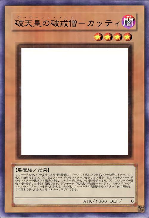 | このカード名の、①の方法による特殊召喚は1ターンに1度しかできず、②の効果は1ターンに1度しか使用できない。①:自分フィールドのモンスターが存在しない場合、または相手フィールドのモンスターの属性が1種類の場合、このカードは手札から特殊召喚できる。②:このカードが召喚・特殊召喚した場合に発動できる。デッキから「破天皇の破戒僧-カッティ」以外の「ゲーゲニッヒ」モンスター1体を手札に加える。その後、フィールドの表側表示モンスター1体の属性を、この効果で手札に加えたモンスターと同じにできる。 | |||