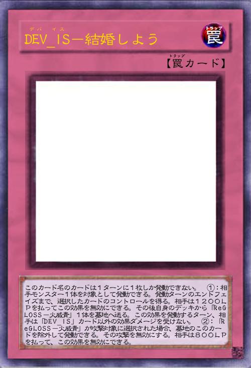 | このカード名のカードは1ターンに1枚しか発動できない。 ①:相手モンスター1体を対象として発動できる。発動ターンのエンドフェイズまで、選択したカードのコントロールを得る。相手は1200LPを払ってこの効果を無効にできる。その後自身のデッキから「ReGLOSS-火威青」1体を墓地へ送る。この効果を発動するターン、相手は「DEV_IS」カード以外の効果ダメージを受けない。 ②:「ReGLOSS-火威青」が攻撃対象に選択された場合、墓地のこのカードを除外して発動できる。その攻撃を無効にする。相手は800LPを払って、この効果を無効にできる。 | |||