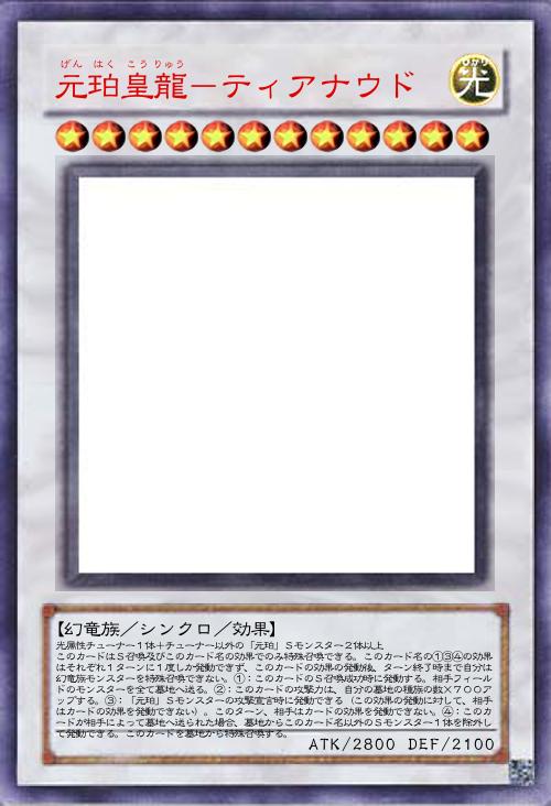 | 光属性チューナー1体+チューナー以外の「元珀」Sモンスター2体以上 このカードはS召喚及びこのカード名の効果でのみ特殊召喚できる。このカード名の①③④の効果はそれぞれ1ターンに1度しか発動できず、このカードの効果の発動後、ターン終了時まで自分は幻竜族モンスターを特殊召喚できない。①:このカードのS召喚成功時に発動する。相手フィールドのモンスターを全て墓地へ送る。②:このカードの攻撃力は、自分の墓地の種族の数×700アップする。③:「元珀」Sモンスターの攻撃宣言時に発動できる(この効果の発動に対して、相手はカードの効果を発動できない)。このターン、相手はカードの効果を発動できない。④:このカードが相手によって墓地へ送られた場合、墓地からこのカード名以外のSモンスター1体を除外して発動できる。このカードを墓地から特殊召喚する。 | |||