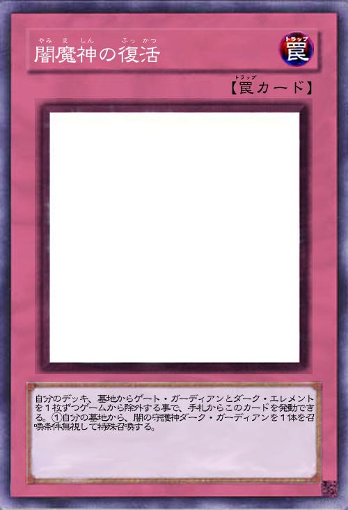 | 自分のデッキ、墓地からゲート・ガーディアンとダーク・エレメントを1枚ずつゲームから除外する事で、手札からこのカードを発動できる。①自分の墓地から、闇の守護神ダーク・ガーディアンを1体を召喚条件無視して特殊召喚する。 | |||