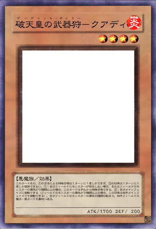 | このカード名の、①の方法による特殊召喚は1ターンに1度しかできず、②の効果は1ターンに1度しか使用できない。①:自分フィールドにモンスターが存在しない場合、またはフィールドのモンスターの属性が3種類以上の場合、このカードは手札から特殊召喚できる。②:自分メインフェイズに発動できる(フィールドのモンスターの属性が3種類以上の場合、この効果は相手メインフェイズでも発動できる)。自分フィールドのモンスターの属性の種類の数まで、相手フィールドの魔法・罠カードを墓地へ送る。 | |||