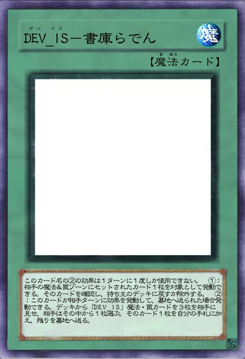 | このカード名の②の効果は1ターンに1度しか使用できない。 ①:相手の魔法&罠ゾーンにセットされたカード1枚を対象として発動できる。そのカードを確認し、持ち主のデッキに戻すか除外する。 ②:このカードが相手ターンに効果を発動して、墓地へ送られた場合発動できる。デッキから「DEV_IS」魔法・罠カードを3枚を相手に見せ、相手はその中から1枚選ぶ。そのカード1枚を自分の手札に加え、残りを墓地へ送る。 | |||