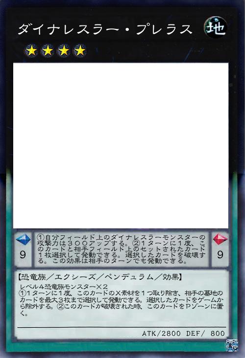 | レベル4恐竜族モンスター×2 ①1ターンに1度、このカードのX素材を1つ取り除き、相手の墓地のカードを最大3枚まで選択して発動できる。選択したカードをゲームから除外する。②このカードが破壊された時、このカードをPゾーンに置く。 | |||