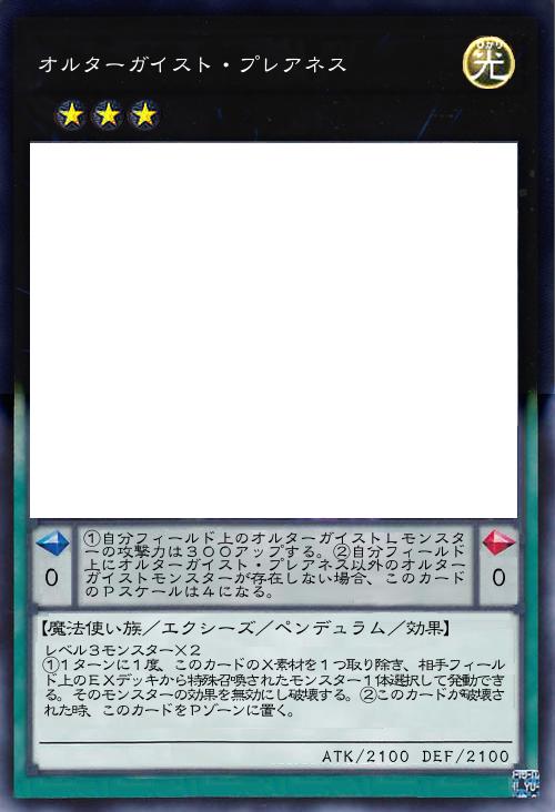 | ①自分フィールド上のオルターガイストLモンスターの攻撃力は300アップする。②自分フィールド上にオルターガイスト・プレアネス以外のオルターガイストモンスターが存在しない場合、このカードのPスケールは4になる。 | |||