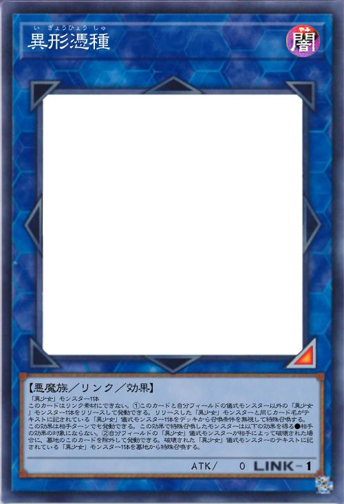 | 「異少女」モンスター1体 このカードはリンク素材にできない。①このカードと自分フィールドの儀式モンスター以外の「異少女」モンスター1体をリリースして発動できる。リリースした「異少女」モンスターと同じカード名がテキストに記されている「異少女」儀式モンスター1体をデッキから召喚条件を無視して特殊召喚する。この効果は相手ターンでも発動できる。この効果で特殊召喚したモンスターは以下の効果を得る●相手の効果の対象にならない。②自分フィールドの「異少女」儀式モンスターが相手によって破壊された場合に、墓地のこのカードを除外して発動できる。破壊された「異少女」儀式モンスターのテキストに記されている「異少女」モンスター1体を墓地から特殊召喚する。 | |||