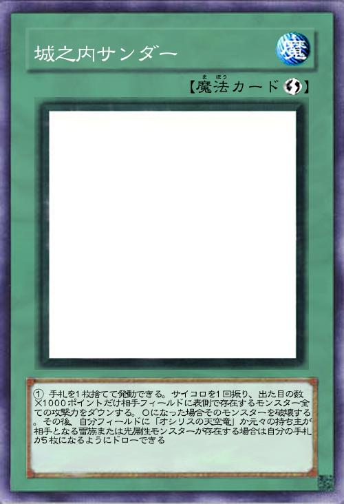 | ① 手札を1枚捨てて発動できる。サイコロを1回振り、出た目の数×1000ポイントだけ相手フィールドに表側で存在するモンスター全ての攻撃力をダウンする。0になった場合そのモンスターを破壊する。その後、自分フィールドに「オシリスの天空竜」か元々の持ち主が相手となる雷族または光属性モンスターが存在する場合は自分の手札が5枚になるようにドローできる | |||