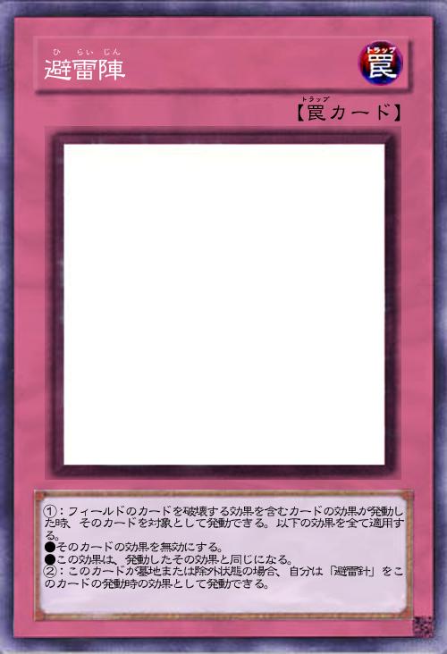 | ①:フィールドのカードを破壊する効果を含むカードの効果が発動した時、そのカードを対象として発動できる。以下の効果を全て適用する。 ●そのカードの効果を無効にする。 ●この効果は、発動したその効果と同じになる。 ②:このカードが墓地または除外状態の場合、自分は「避雷針」をこのカードの発動時の効果として発動できる。 | |||