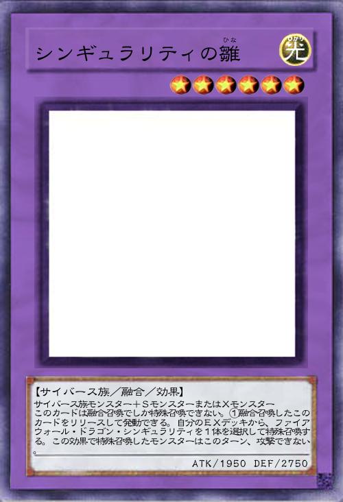 | サイバース族モンスター+SモンスターまたはXモンスター このカードは融合召喚でしか特殊召喚できない。①融合召喚したこのカードをリリースして発動できる。自分のEXデッキから、ファイアウォール・ドラゴン・シンギュラリティを1体を選択して特殊召喚する。この効果で特殊召喚したモンスターはこのターン、攻撃できない。 | |||
