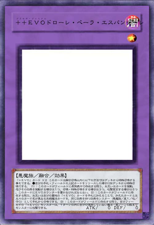 | 「+EVO」カード×2 このカードは融合召喚以外に以下の方法でEXデッキから特殊召喚する事もできる。●自分の手札・フィールドの上記カードをリリースした場合にEXデッキから特殊召喚できる。 (1):このカードがフィールドに表側表示で存在する限り、お互いはカードを発動、及びその効果を発動する場合は1つ、召喚・特殊召喚をする場合は3つ、攻撃宣言する場合は5つ、このカードにEVOカウンターを置かなければならない。(2):このカードがフィールドに存在する限り、お互いは自分の墓地の「+EVO」カードを手札に加えることで、加えたカードとは元々のカード名が異なる永続魔法カードを、同じ効果を持つ効果モンスター(悪魔族/星1/攻/守0)として手札から召喚できる。(3):このカードがフィールドに存在する限り、自分フィールドの「+EVO」モンスターは、1ターンの内に自分の使用していない魔法・罠ゾーンの数までモンスターに攻撃できる。 | |||