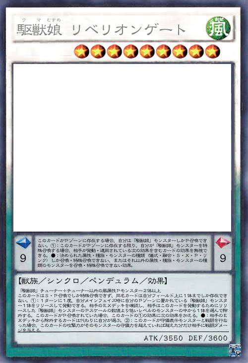 | 「駆獣娘」チューナー+チューナー以外の風属性Pモンスター2体以上 このカードはS・P召喚でしか特殊召喚できず、同名カードは自分フィールド上に1体までしか存在できない。①:1ターンに1度、自分メインフェイズ時に自分のPゾーンに置かれている「駆獣娘」モンスター1体をリリースして発動できる。相手のEXデッキを確認し、相手はこのカードを発動するためにリリースした「駆獣娘」モンスターのPスケールの数値より低いレベルのモンスターの中から1体を選んで除外する。このカードがP召喚されていた場合、このカードの①の効果に次の効果を加える。●:相手のEXデッキから除外するカードは代わりに自分が選ぶ。②:このカードが守備表示モンスターと戦闘を行なった場合、このカードの攻撃力がそのモンスターの守備力を超えていれば超えた分だけ相手に戦闘ダメージを与える。 | |||