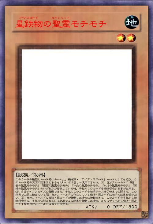 | このカードの種族とカード名はルール上、機械族・「アイアンスタード」カードとしても扱う。このカード名の②③の効果はどちらも1ターンに1度しか使用できない。①:自分フィールドに「福音の聖霊モチモチ」「嵐雷の聖霊モチモチ」「水晶の聖霊モチモチ」「紅焔の聖霊モチモチ」「深緑の聖霊モチモチ」のいずれかが存在している時、手札のこのカードを特殊召喚する事が出来る。②:自分メインフェイズに発動できる。手札のこのカードを相手ターン終了時まで公開する。この効果で公開し続けている間、自分フィールドに存在している魔法・罠カードは相手の効果を受けない。③:自分フィールドの魔法・罠カードが発動した場合に発動できる。このカードを手札から特殊召喚する。手札で公開されている状態でこの効果を発動した場合、さらにデッキから魔法・罠カード1枚を自分フィールドにセットできる。 | |||