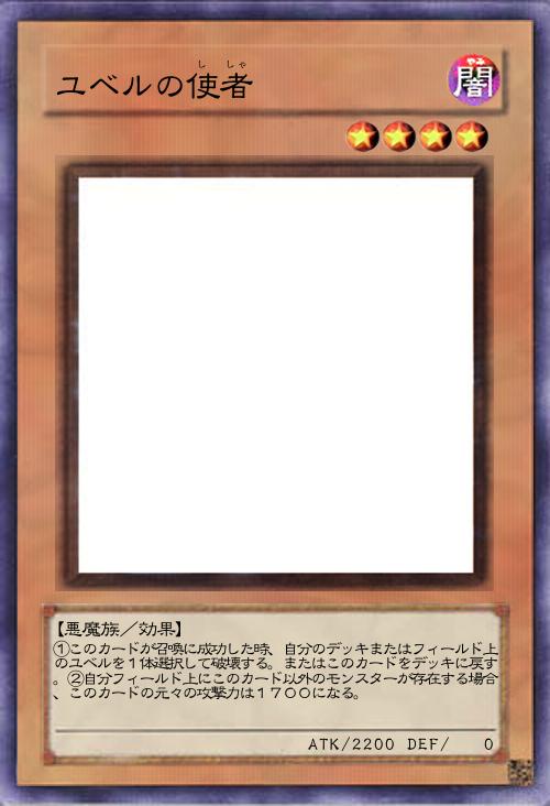 | ①このカードが召喚に成功した時、自分のデッキまたはフィールド上のユベルを1体選択して破壊する。またはこのカードをデッキに戻す。②自分フィールド上にこのカード以外のモンスターが存在する場合、このカードの元々の攻撃力は1700になる。 | |||