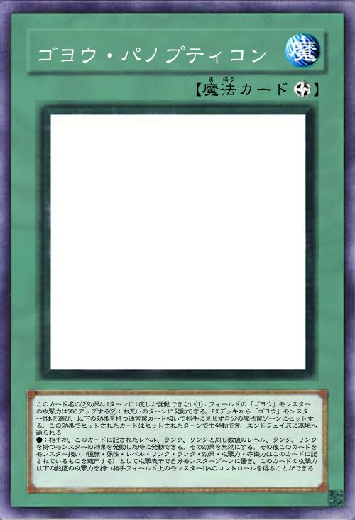 | このカード名の②効果は1ターンに1度しか発動できない①:フィールドの「ゴヨウ」モンスターの攻撃力は300アップする②:お互いのターンに発動できる。EXデッキから「ゴヨウ」モンスター1体を選び、以下の効果を持つ通常罠カード扱いで相手に見せず自分の魔法罠ゾーンにセットする。この効果でセットされたカードはセットされたターンでも発動でき、エンドフェイズに墓地へ送られる ●:相手が、このカードに記されたレベル、ランク、リンクと同じ数値のレベル、ランク、リンクを持つモンスターの効果を発動した時に発動できる。その効果を無効にする。その後このカードをモンスター扱い(種族・属性・レベル・リンク・ランク・効果・攻撃力・守備力はこのカードに記されているものを適用する)として攻撃表示で自分モンスターゾーンに置き、このカードの攻撃力以下の数値の攻撃力を持つ相手フィールド上のモンスター1体のコントロールを得ることができる | |||