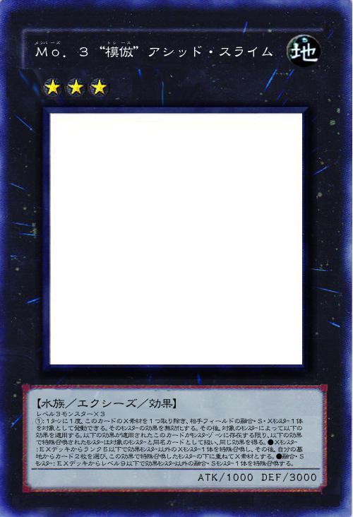 | レべル3モンスター×3 ①:1ターンに1度、このカードのX素材を1つ取り除き、相手フィールドの融合・S・Xモンスター1体を対象として発動できる。そのモンスターの効果を無効化する。その後、対象のモンスターによって以下の効果を適用する。以下の効果が適用されたこのカードがモンスターゾーンに存在する限り、以下の効果で特殊召喚されたモンスターは対象のモンスターと同名カードとして扱い、同じ効果を得る。●Xモンスター:EXデッキからランク5以下で効果モンスター以外のXモンスター1体を特殊召喚し、その後、自分の墓地からカード2枚を選び、この効果で特殊召喚したモンスターの下に重ねてX素材とする。●融合・Sモンスター:EXデッキからレベル9以下で効果モンスター以外の融合・Sモンスター1体を特殊召喚する。 | |||