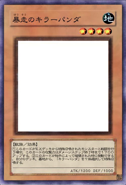 | ①このカードがEXデッキから特殊召喚されたモンスターと戦闘を行う場合、このカードの攻撃力はダメージステップ終了時まで1700アップする。②このカードが相手によって破壊された時に発動できる。自分のデッキ、墓地から、「キラーパンダ」を1体選択して特殊召喚する。 | |||