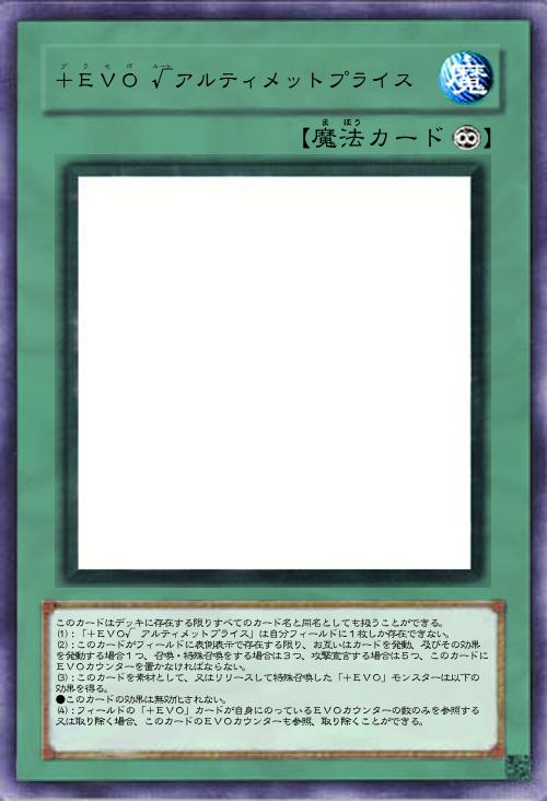 | このカードはデッキに存在する限りすべてのカード名と同名としても扱うことができる。 (1):「+EVO√ アルティメットプライス」は自分フィールドに1枚しか存在できない。 (2):このカードがフィールドに表側表示で存在する限り、お互いはカードを発動、及びその効果を発動する場合1つ、召喚・特殊召喚をする場合は3つ、攻撃宣言する場合は5つ、このカードにEVOカウンターを置かなければならない。 (3):このカードを素材として、又はリリースして特殊召喚した「+EVO」モンスターは以下の効果を得る。 ●このカードの効果は無効化されない。 (4):フィールドの「+EVO」カードが自身にのっているEVOカウンターの数のみを参照する又は取り除く場合、このカードのEVOカウンターも参照、取り除くことができる。 | |||