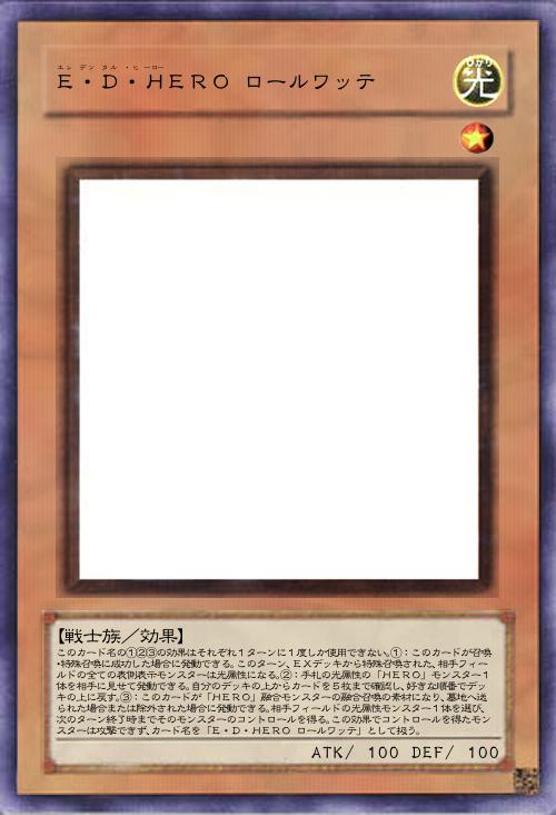 | このカード名の①②③の効果はそれぞれ1ターンに1度しか使用できない。①:このカードが召喚・特殊召喚に成功した場合に発動できる。このターン、EXデッキから特殊召喚された、相手フィールドの全ての表側表示モンスターは光属性になる。②:手札の光属性の「HERO」モンスター1体を相手に見せて発動できる。自分のデッキの上からカードを5枚まで確認し、好きな順番でデッキの上に戻す。③:このカードが「HERO」融合モンスターの融合召喚の素材になり、墓地へ送られた場合または除外された場合に発動できる。相手フィールドの光属性モンスター1体を選び、次のターン終了時までそのモンスターのコントロールを得る。この効果でコントロールを得たモンスターは攻撃できず、カード名を「E・D・HERO ロールワッテ」として扱う。 | |||