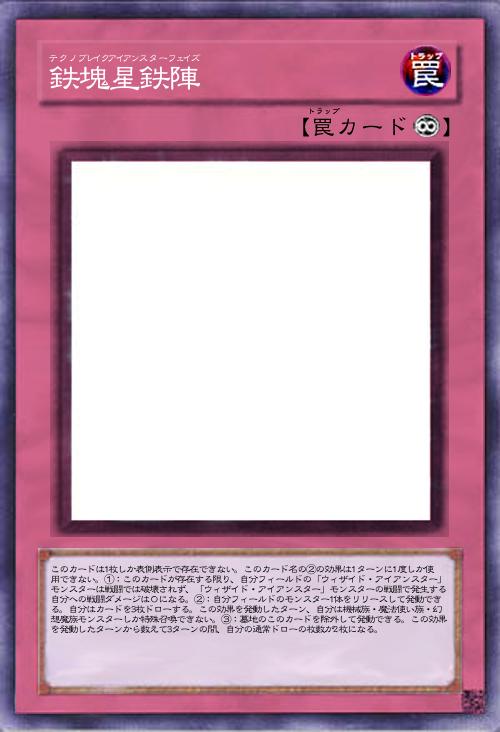 | このカードは1枚しか表側表示で存在できない。このカード名の②の効果は1ターンに1度しか使用できない。①:このカードが存在する限り、自分フィールドの「ウィザイド・アイアンスター」モンスターは戦闘では破壊されず、「ウィザイド・アイアンスター」モンスターの戦闘で発生する自分への戦闘ダメージは0になる。②:自分フィールドのモンスター1体をリリースして発動できる。自分はカードを3枚ドローする。この効果を発動したターン、自分は機械族・魔法使い族・幻想魔族モンスターしか特殊召喚できない。③:墓地のこのカードを除外して発動できる。この効果を発動したターンから数えて3ターンの間、自分の通常ドローの枚数が2枚になる。 | |||