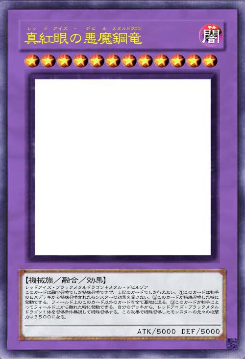 | レッドアイズ・ブラックメタルドラゴン+メタル・デビルゾア このカードは融合召喚でしか特殊召喚できず、上記のカードでしか行えない。①このカードは相手のEXデッキから特殊召喚されたモンスターの効果を受けない。②このカードが特殊召喚した時に発動できる。フィールド上のこのカード以外のカードを全て墓地に送る。③このカードが相手によってフィールド上から離れた時に発動できる。自分のデッキから、レッドアイズ・ブラックメタルドラゴン1体を召喚条件無視して特殊召喚する。この効果で特殊召喚したモンスターの元々の攻撃力は3500になる。 | |||