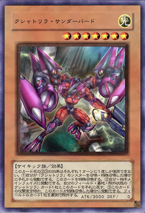 | このカード名の②③の効果はそれぞれ1ターンに1度しか使用できない。①自分が「クシャトリラ」モンスターを召喚・特殊召喚した場合に手札から発動できる。このカードを特殊召喚する。②自分・相手メインフェイズに発動できる。自分のフィールド・墓地・除外状態の「クシャトリラ」カード1枚とこのカードを手札に戻す。③このカードの攻撃宣言時か、このカードが特殊召喚した場合に発動できる。フィールドのカード1枚を裏側で除外する。 | |||